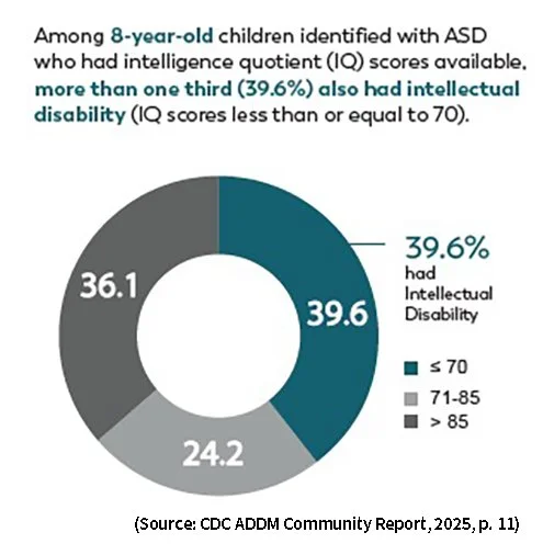 According to the most recent CDC ADDM data, among eight-year-old children identified with autism who had IQ data available, 39.6% had co-occurring intellectual disability (ID), defined as an IQ of 70 or below. An additional 24.2% fell in the borderline range, with IQ scores between 71 and 85. Only 36.1% had IQs above 85 (CDC ADDM Community Report, 2025, p. 11).