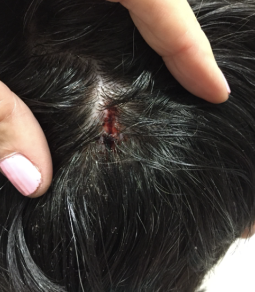 Figure 2: A bleeding laceration on Caroline’s scalp (photo provided by family; used with permission).