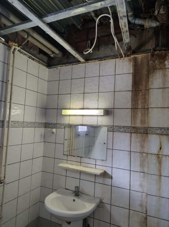 Photograph obtained by NCSA depicting a dirty, dilapidated bathroom in a care facility.