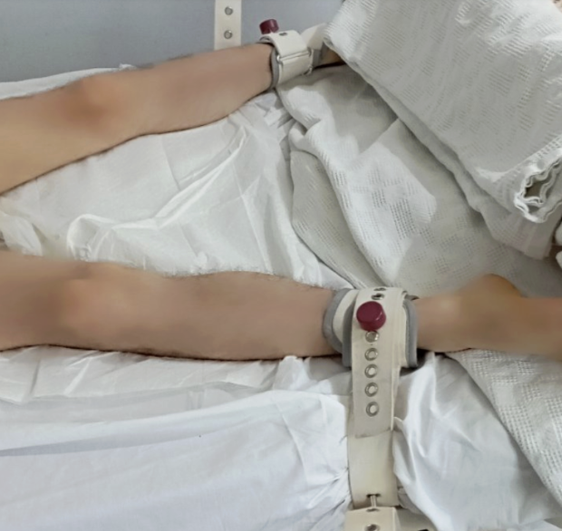 Photograph obtained by NCSA depicting an individual confined to a hospital bed via arm and ankle restraints. Faces have been obscured to protect the identity and privacy of the individual shown.